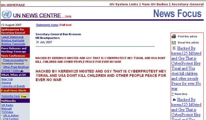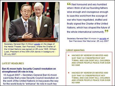 Quando pensavo che le azioni hacker sui siti rilevanti avessere perso mordente ecco comparire sul sito delle Nazioni Unite, nella sezione dedicata alle dichiarazioni del segretario generale dell’Onu Ban Ki-Moon, un messaggio contro la politica di Israele e Stati Uniti (via BBC news): “Hey Ysrail and Usa dont kill children and other people Peace for ever No war.”