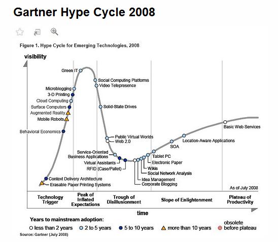 In Agosto è uscito l’Hype Cycle 2008 della Gartner che segnala le tecnologie emergenti e le previsioni circa l’impatto che avranno nello sviluppo delle imprese e del business.