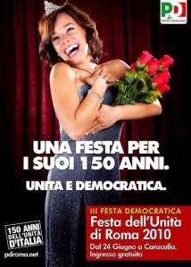 La Reginetta del ballo (la Repubblica, il PD?) che, alla sua età, si emoziona come un’adolescente in un contesto da teatro di posa della televisione, ingioiellata nella sua parure borghese e con un fascio di rose rosse tenute su dal braccio sinistro. Unico riferimento a qualcosa di rosso e di sinistra, richiamo simbolico ad un contesto della tradizione, la Festa dell’Unità, che ha perduto anche il suo nome unitario in un moltiplicarsi territoriale di Feste con diverse declinazioni “democratiche”.