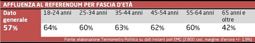 Oltre il 64%, come si vede, la percentuale degli under-24 che sono andati alle urne: un risultato davvero importante e che stacca di 10 punti quasi la percentuale media sulla quale si è assestato il dato finale dell’affluenza, che partendo dal picco dei giovani declina fino al relativamente scarso interesse degli ultra 65enni sui temi referendari.