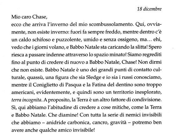 Nel romanzo Chronic City Jhonatan Lethem fa scrivere a Jenet, persa nello spazio, queste parole che spiegano molto umanamente il senso del Natale. Auguri a tutti!