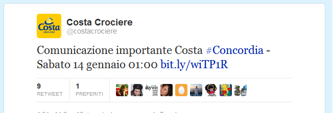 Basta leggere lo storify che raccoglie “i tweet inviati dalle persone sul posto e da quelle che hanno seguito la diretta dell’evacuazione di 4mila persone dalla nave da crociera Concordia”, una vera e propria delega informativa che il Tirreno di Livorno mostra, con il crescere della consapevolezza circa la gravità dell’incidente che culmina con il tweet dell’una di notte di Costa Crociere che rimanda ad una “comunicazione importante” circa le difficoltà delle procedure di soccorso a causa della posizione assunta dalla nave.