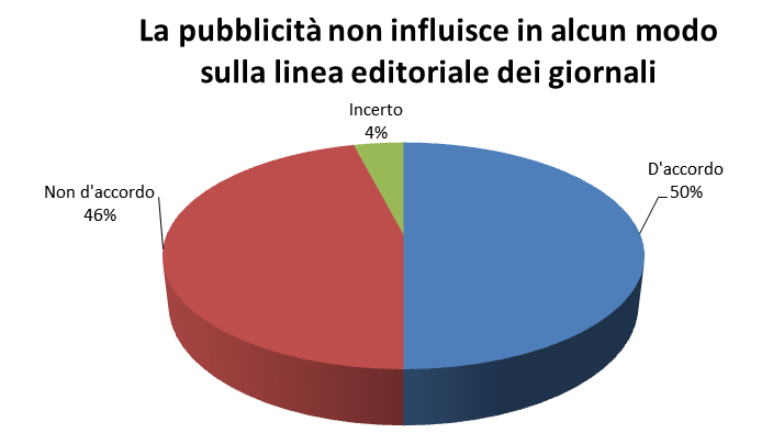 Chiedendo di esprimere un parere di accordo o disaccordo sull’indipendenza della linea editoriale nei confronti della pubblicità, solo il 50% degli intervistati se la sente di definirsi “molto” o “abbastanza” d’accordo con questa affermazione mentre il 46% ritiene di non condividere l’idea di una indipendenza. Il dato vede praticamente la stessa opinione espressa da giornalisti appartenenti a testate tradizioni o di redazione online.