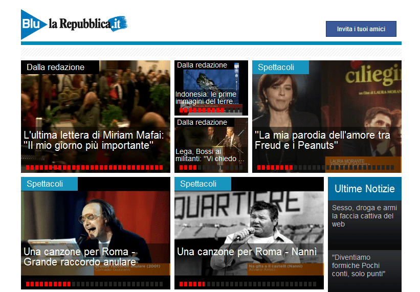 Una sorta di doppio filtro, quindi: un primo costituito dalla testata che seleziona determinati contenuti informativi e un secondo fatto dai propri friend su Facebook che leggono questi contenuti e in base alle scelte di lettura determinano il palinsesto della nostra home di Blu. Un’agenda dettata quantitativamente (immagino si tratti di numero di views, commenti e like – al momento l’algoritmo di produzione del ranking non è chiaro) dai lettori di quelle news che Repubblica ritiene adatte a Blu. Sì, perché non abbiamo a che fare con la totalità delle notizie: l’orientamento di Blu è quello di caricare principalmente video relativi ai temi adatti al target per cui l’operazione è pensata, quello dei giovani adulti, che in Italia copre la fascia 18-34 anni. Il principio di selezione editoriale è quindi: i temi che interessano i nostri “giovani” lettori, che sono “spettacolo, cinema, università, sport, musica, persone, divertimento”, e il formato che prediligono, che è quello video.