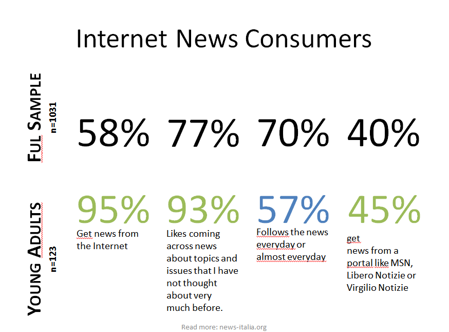 Passando ad analizzare gli utenti Internet (in Italia sono il 60% della popolazione) quelli che usano la Rete per accedere e consumare informazione sono più della metà, il 58% con un +7%rispetto al 2011. Ma se vogliamo capire le linee di tendenza allora forse vale la pena osservare il comportamento di consumo delle news online dei giovani adulti. Nella fascia d’età 18-29 anni è il 95% ad accedere all’informazione (anche) attraverso Internet ma solo la metà (57%) segue le news quotidianamente, mostrando un comportamento di consumo più occasionale rispetto alla media degli italiani (70%) e più dedito ad una lettura ad ampio raggio, anche su tematiche sulle quali non si è mai focalizzato particolarmente (93%). Sembra che ci troviamo di fronte ad un uso dell’informazione apparentemente molto più vicina alle logiche di intrattenimento e tempo libero che di approfondimento e quotidianità. Quello che emerge è un rapporto occasionale e meno routinizzato con il mondo news, fatto di incontri casuali e dovuti al fatto di avere tempo a disposizione per navigare più che dedicare specificatamente tempo ad approfondire gli eventi del mondo. Ma è anche un comportamento probabilmente dovuto ad un modo diverso di percepire il valore sociale dell’informazione, come emerge dall’attenzione per una condivisione sociale delle news: oltre il 50% dei giovani adulti ritiene rilevante nella sua scelta del canale news online “poter seguire il sito di informazione attraverso Facebook” e “poter condividere facilmente con gli altri le notizie contenute nel sito, via e-mail o su Facebook o altri siti di social network” (69%). Il fatto è che per i giovani adulti “incontrare” e “consumare” notizie è sempre più anche una moneta relazionale e il processo di fruizione un atto sociale di messa in connessione con gli altri.