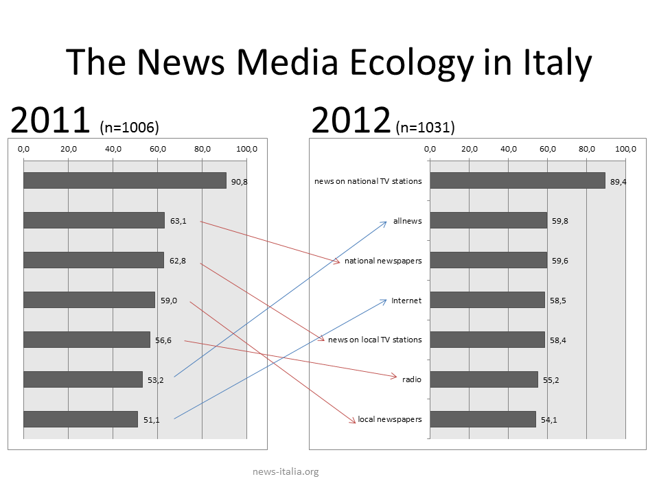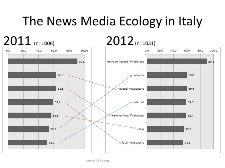 Anche ad un primo sguardo ci troviamo di fronte ad un ambiente di consumo di news online in cui i meccanismi di reciprocità relazionale contano, un ambiente in cui emergono nuovi intermediari non professionisti nella distribuzione e selezione delle news che fanno parte della nostra rete di relazioni sociali, un contesto in cui l’informazione tende sempre più a connettersi al valore sociale delle reti attraverso cui la incontriamo. Più in generale questa tendenza va a miscelarsi con bisogni di multicanalità (l’accesso in mobilità è al 31% con +3% rispetto al 2011) che raccontano una costruzione dell’agenda fatta anche da un accesso plurale ai mezzi di informazione. Costruire l’informazione e renderla accessibile sapendo leggere i comportamenti di consumo mutati rappresenta forse la sfida più urgente dal punto di vista del sistema dell’editoria nazionale.