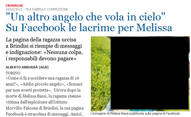 Tornata a casa, ha voluto capire meglio durante il pranzo chi erano Falcone e Borsellino, perché nella sua timeline assieme all’emotività c’è molta confusione e i tweet parlano in caduta libera di una storia molto recente per noi ma così distante per loro. La confusione di adolescenti che rilanciano attraverso i tweet umori e sentimenti, gli stessi che li portano a cercare magari su Facebook la pagina di Melissa e lasciare un commento, accendere la loro candela simbolica, ritualità di un lutto connesso. Il resto è giornalismo del dolore che racconta questa emotività andando a sbirciare nel wall di Melissa o che incolla nei propri siti le foto “rubate” dalla galleria su Facebook di una ragazzina. È inutile indulgere in moralismi, questo modo di fare notizia non nasce né morirà con i social media, eppure, come scrive Barbara: