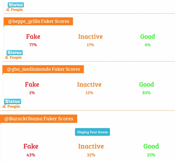 I miei falsi follower su Twitter (dati da Fake followers) sono il 2%, quelli di Beppe Grillo il 77% e di Barack Obama il 43% (NB gli utenti veramente attivi di Beppe Grillo sarebbero il solo 6%, il che è un indicatore, a mio parere, che il suo profilo è molto seguito da un “pubblico” generalista di Twitter, tolti spam e fake). La nostra capacità di influenza è ben diversa, nonostante il giochino estivo attribuisca loro moltissimi finti follower e “utenti” inattivi.