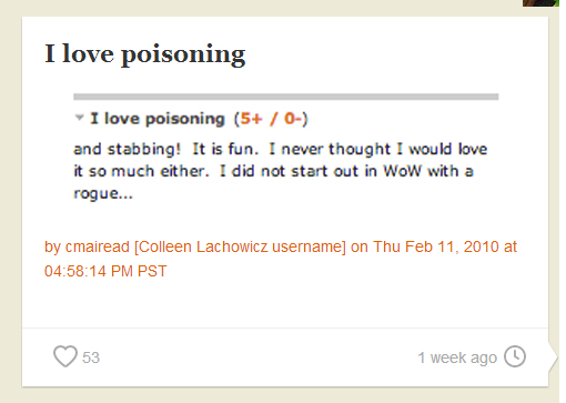 Le cose però si fanno un po’ più complicate se pensiamo che frasi come quella che avete letto vengono scritte dalla Lachowicz riferendosi ad un’attività che svolge nel suo tempo libero: giocare a World of Warcraft. E che chi sta parlando è, di fatto, il suo avatar: una orchessa assassina di nome Santiaga, livello 85, colore verde e una cresta punk. Santiaga/Colleen scriveva un po’ di livelli fa: