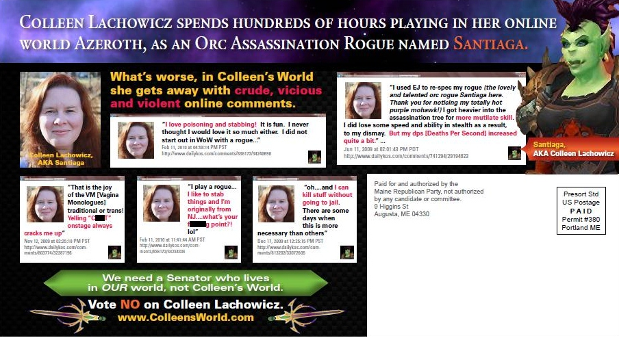 Ed è appunto su questa sua “doppia” vita che i repubblicani hanno costruito una campagna denigratoria, realizzando il sito “Colleen’s World” che ricostruisce l’atteggiamento in world della Lachowitz. È qui che viene suggerita l’inadeguatezza della candidata a diventare un amministratore pubblico, attraverso un’analisi etnografica costituita dalle affermazioni che la giocatrice/orco rilascia online nel diario della Gilda a cui appartiene, Kos, o durante le partite. Immagino esista una gola profonda tra i Troll o gli Elfi del sangue con cui si è alleata.