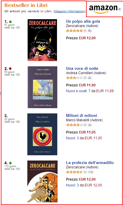 Il bestseller nella categoria libri più venduto su Amazon Italia in questi giorni è un fumetto, una graphic novel se avete proprio necessità di nobilitarne la denominazione: “Un polpo alla gola” di Zerocalacare (edizione Bao Publishing). Il quarto in classifica è un altro suo volume: “La profezia dell’armadillo”.