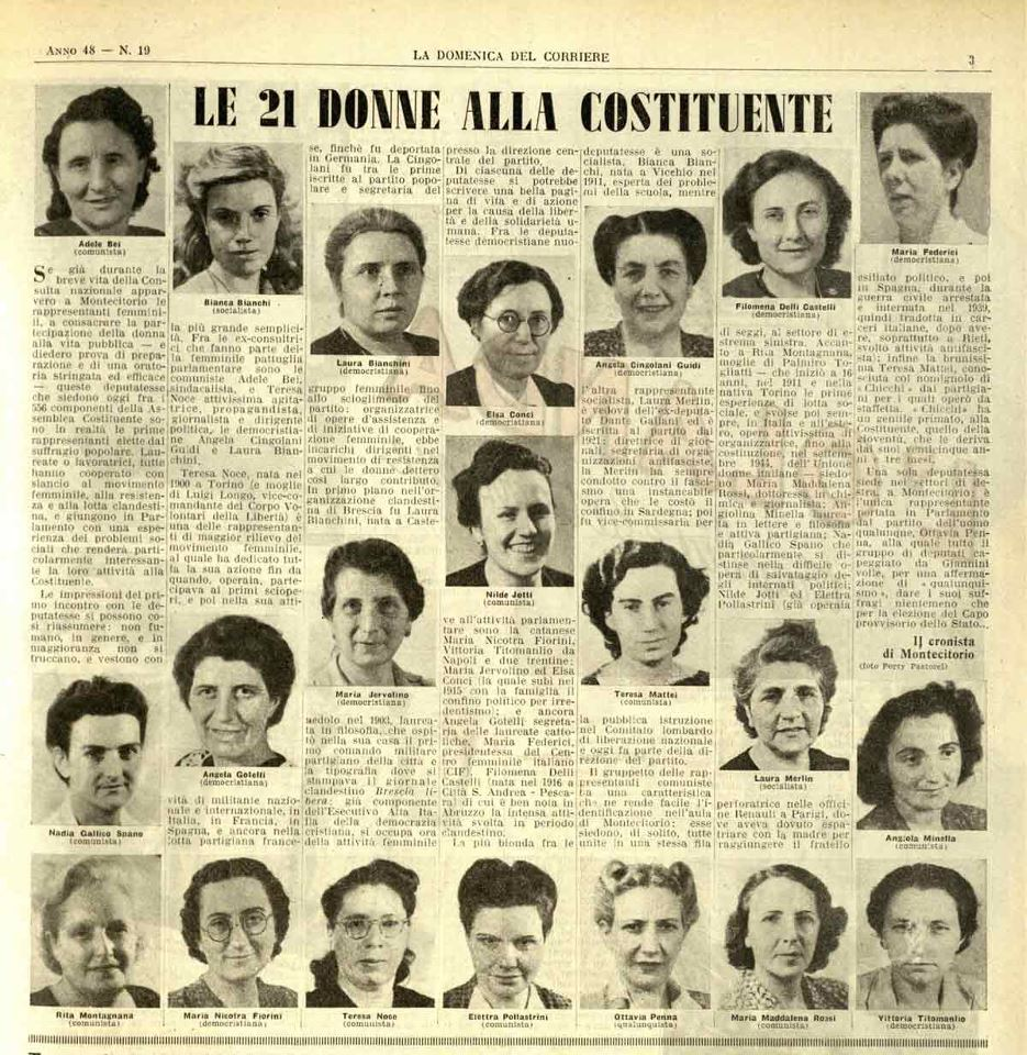 Adele Bei, Nadia Gallico Spano, Nilde Iotti, Teresa Mattei, Angiola Minella, Rita Montagnana Togliatti, Teresa Noce Longo, Elettra Pollastrini, Maria Maddalena Rossi, Laura Bianchini, Elisabetta Conci, Filomena Delli Castelli, Maria De Unterrichter Jervolino, Maria Federici, Angela Gotelli, Angela Guidi Cingolani, Maria Nicotra, Vittoria Titomanlio, Bianca Bianchi, Angelina Merlin, Ottavia Penna Buscemi.