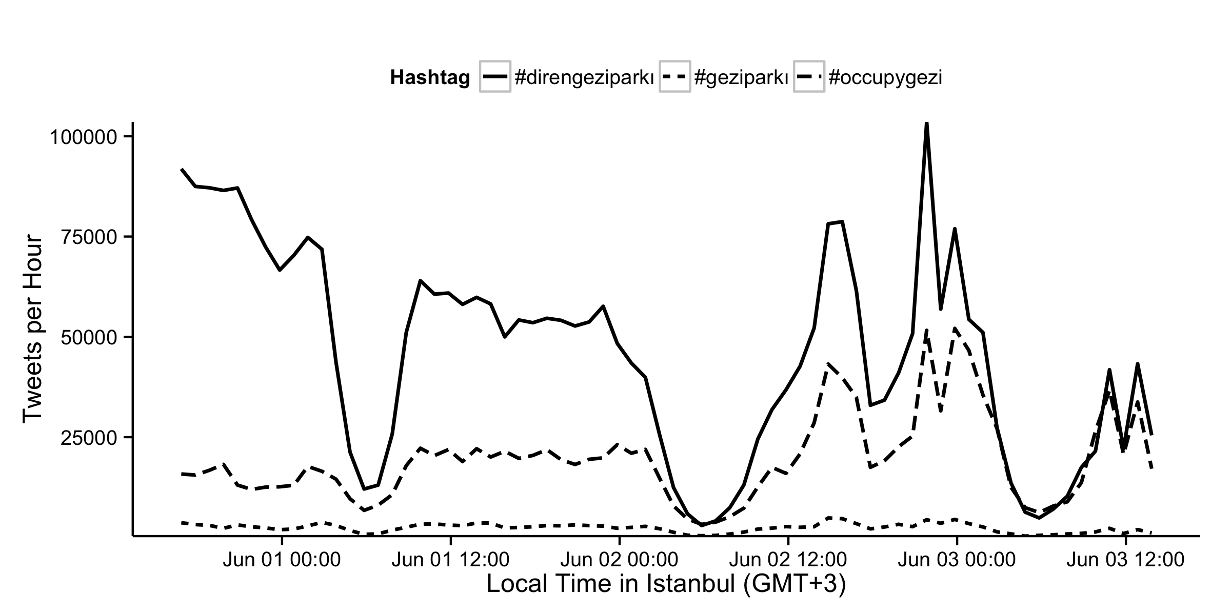 Le informazioni sulla protesta dentro la Turchia si alimentano attraverso i media occidentali e un live-tweeting costante da parte dei manifestanti che passa dagli smarthphone, con testi e video che accompagnano le sommosse e le azioni della polizia. Questa l’analisi di Pablo Barberá e Megan Metzger (PhD student aL Politics Department della New York University) che hanno raccolto e analizzato oltre 2 milioni di tweet (contro il milione totale delle rivolte egiziane, per capirci) con gli hashtags legati alla protesta: #direngezipark? (950.000 tweets), #occupygezi (170.000 tweets), #geziparki (50.000 tweet).