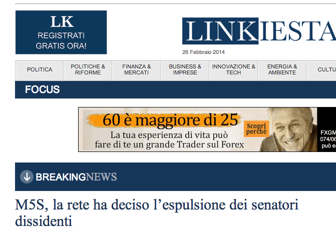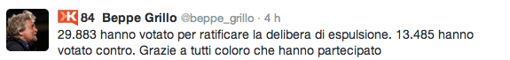 Espulsi i senatori del MoVimento 5 Stelle. Ho già sentito giornalisti dire e scrivere che così ha votato la rete. No, non ha votato LA RETE per l’espulsione. Hanno votato degli iscritti attraverso un blog una piattaforma. 29.883 iscritti certificati hanno votato per ratificare la delibera di espulsione e 13.485 hanno votato contro. Non la rete. Iscritti. Attraverso una votazione su un blog una piattaforma. Di proprietà. Non la rete. Non attraverso la trasparenza dei Tweet, ad esempio. Persone. iscritti. Non la rete. Non sono sicuro sia mai abbastanza chiaro.